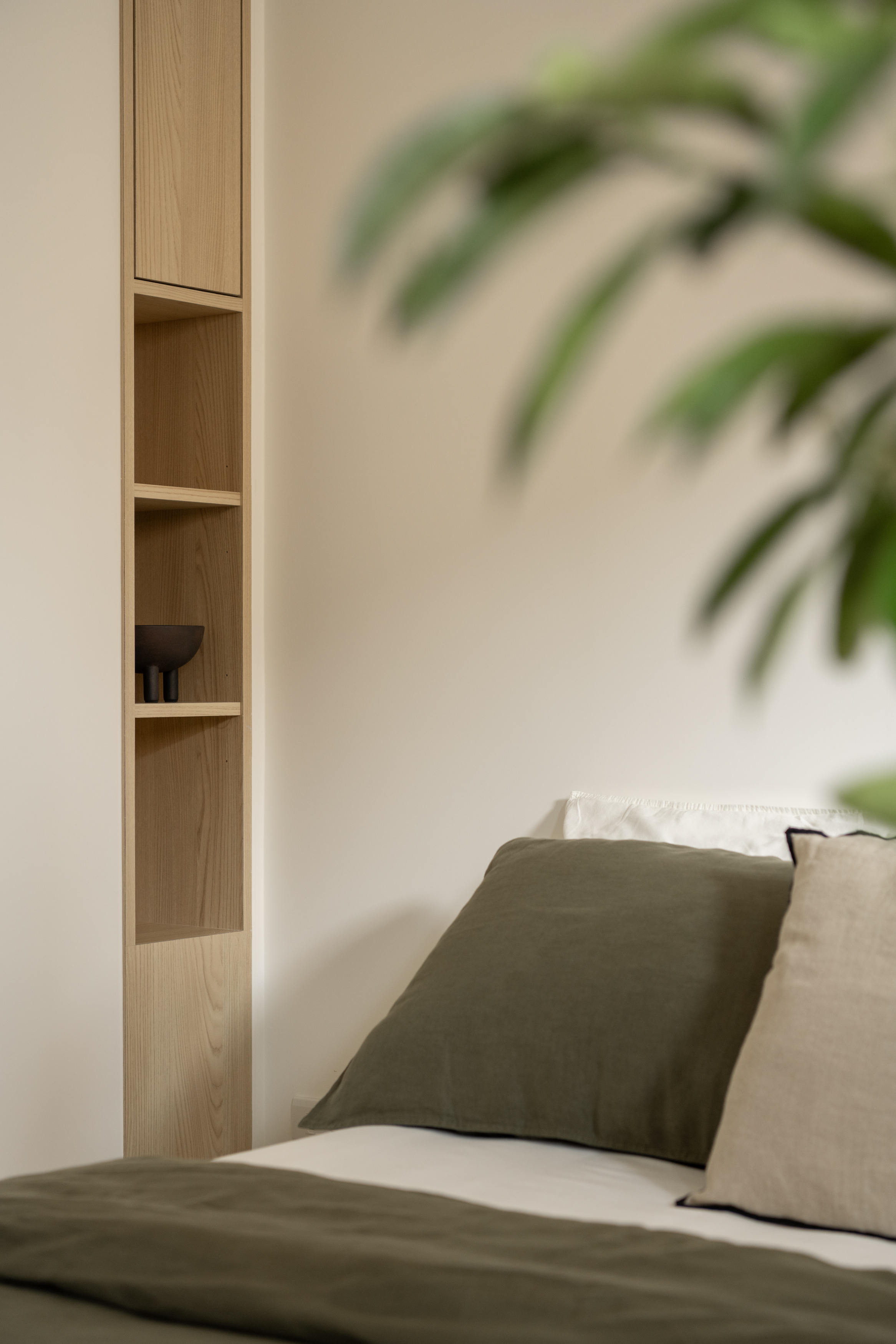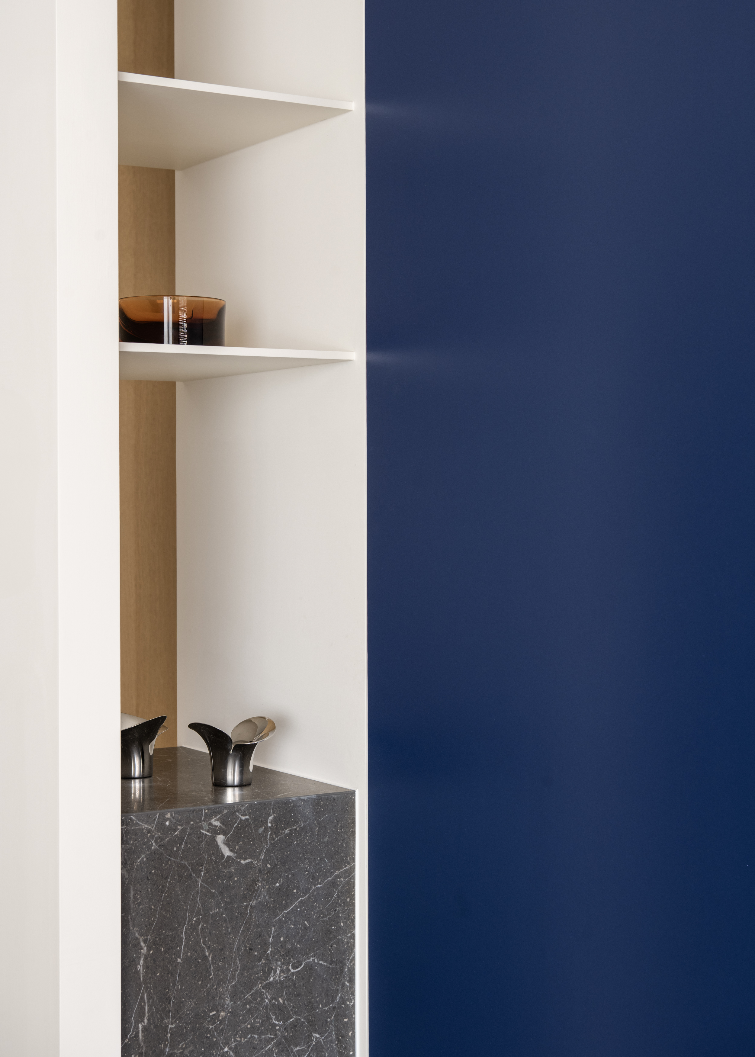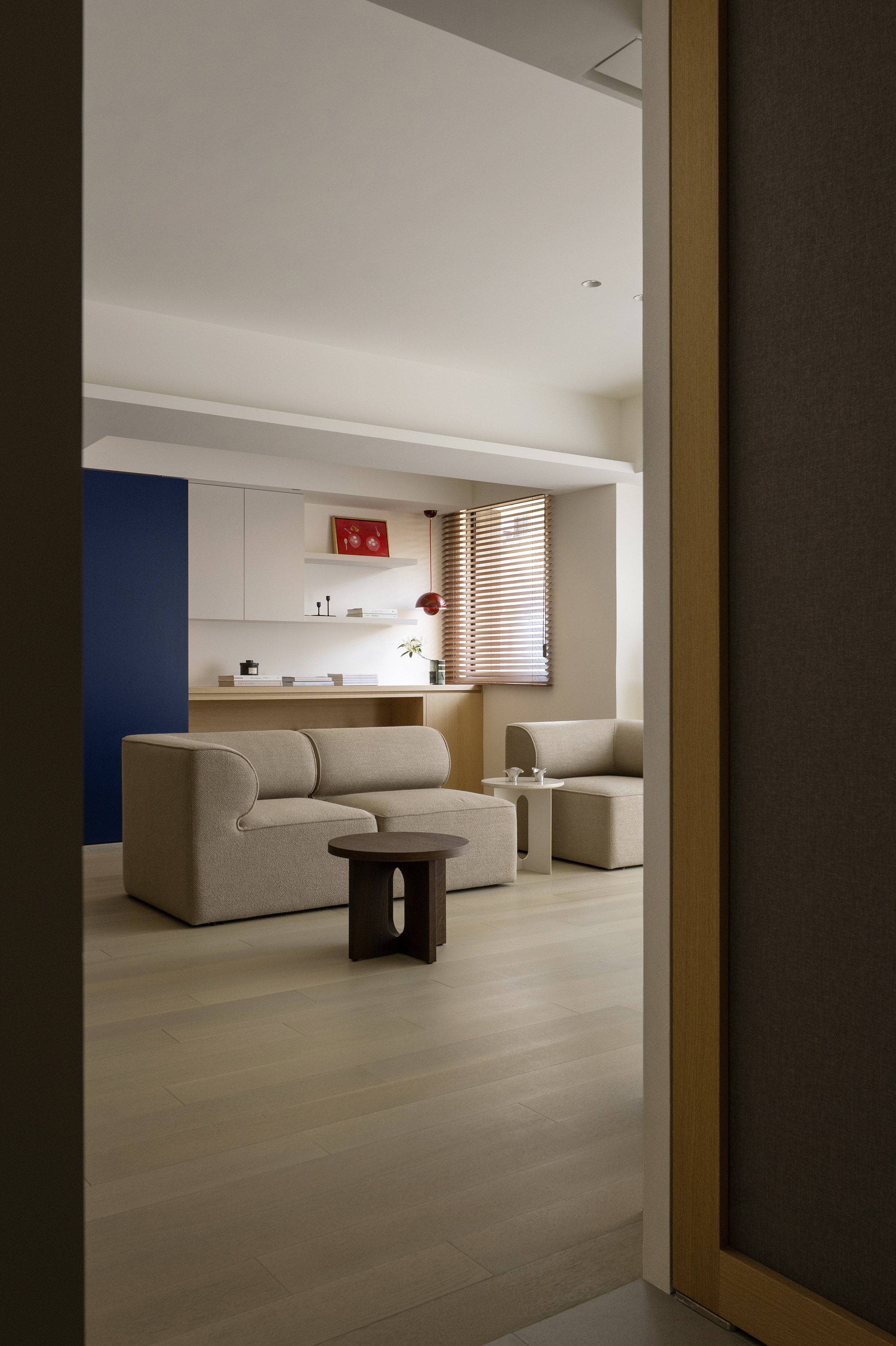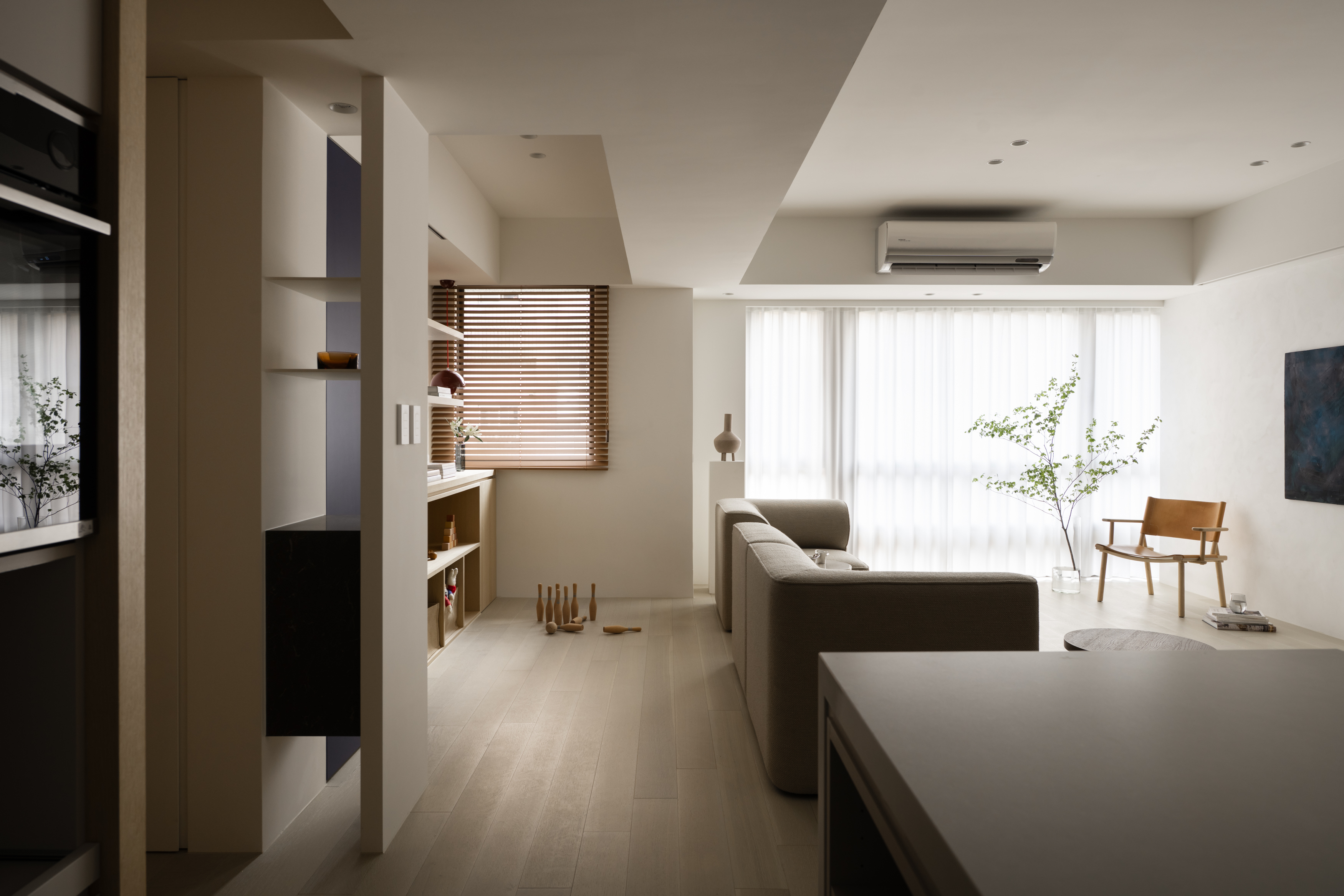 一家三口住在避靜的巷弄內。男主人喜歡烹飪,開放式廚房成為此案改造的最大亮點,此區有通往陽台的動線,因此將櫥櫃和通道動線整合設計,讓廚房、 中島及餐廳,以櫥櫃色系串聯並延續成一段和諧有秩序地畫面。