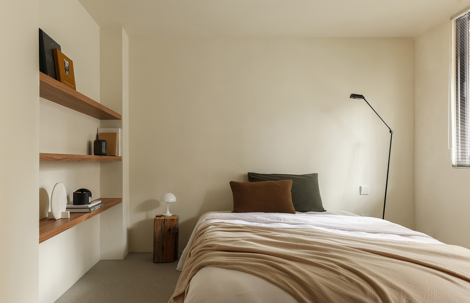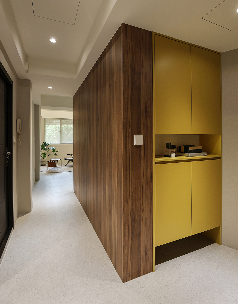 整體色調以胡桃、米黃、深灰為基底,還有一個男女主人共同喜愛的暖陽黃色,規劃於鞋櫃區,提醒著彼此每天出門與回家時,都有愉悅心情。