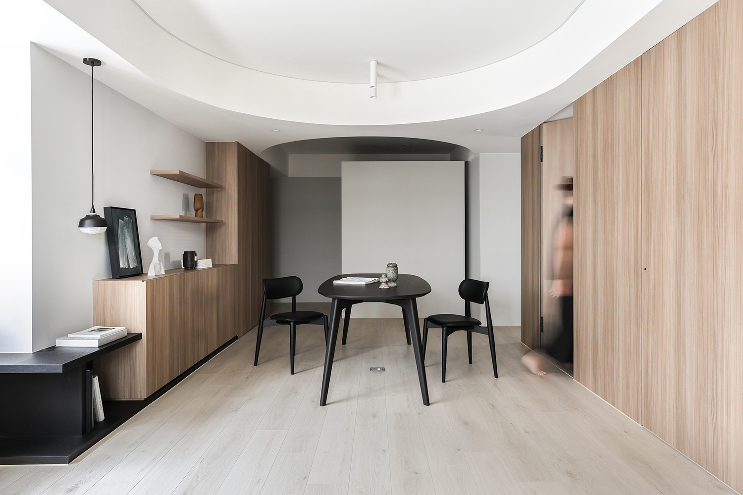 入口進來的儲藏室,滿足屋主衝浪設備和大型物品的收納需求。走往客餐廳,兩道分別通往廚房及主臥室的隱藏門,串聯破碎的牆體、延伸電視牆的範圍並放大視覺比例。餐廳背牆除了規劃收納櫃體及展示平台,同時為了消弭客餐廳之間的牆體落差,以 L型矮台搭配吊燈來弱化之,並豐富空間層次感。