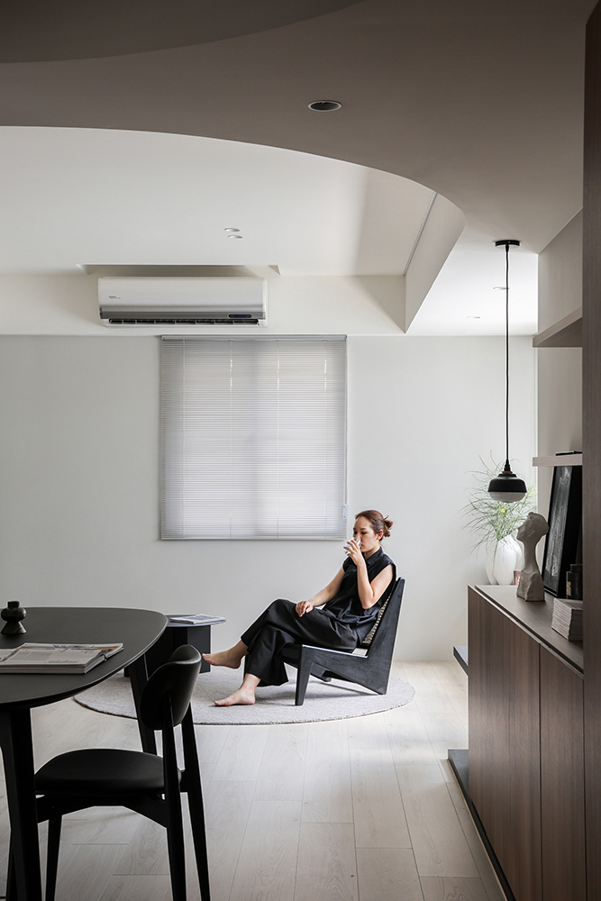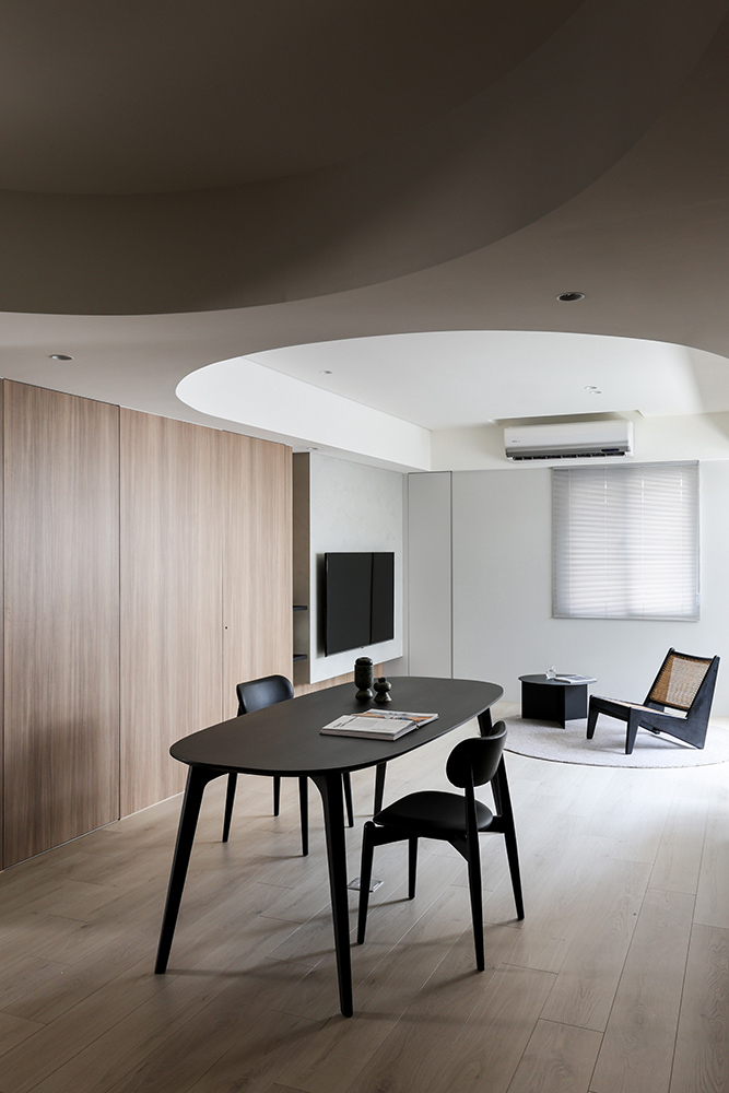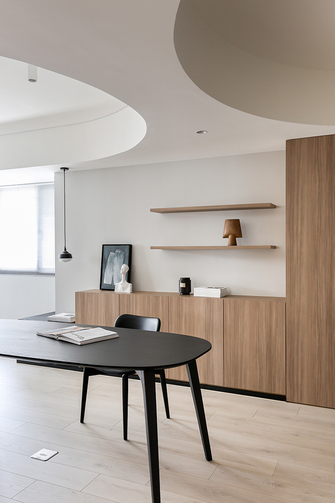 既有格局因不得變動,公領域有許多畸零空間,還有最需要克服的問題是餐廳上方橫跨了結構樑。因此,在設計規劃時, 將此區塑造出完整的長型場域,以有機圓弧的天花造型將客餐廳及隔牆不到頂的儲藏室連成一氣,優雅律動的姿態,消化大樑壓迫感,並賦予公領域柔和、輕鬆的氛圍。
