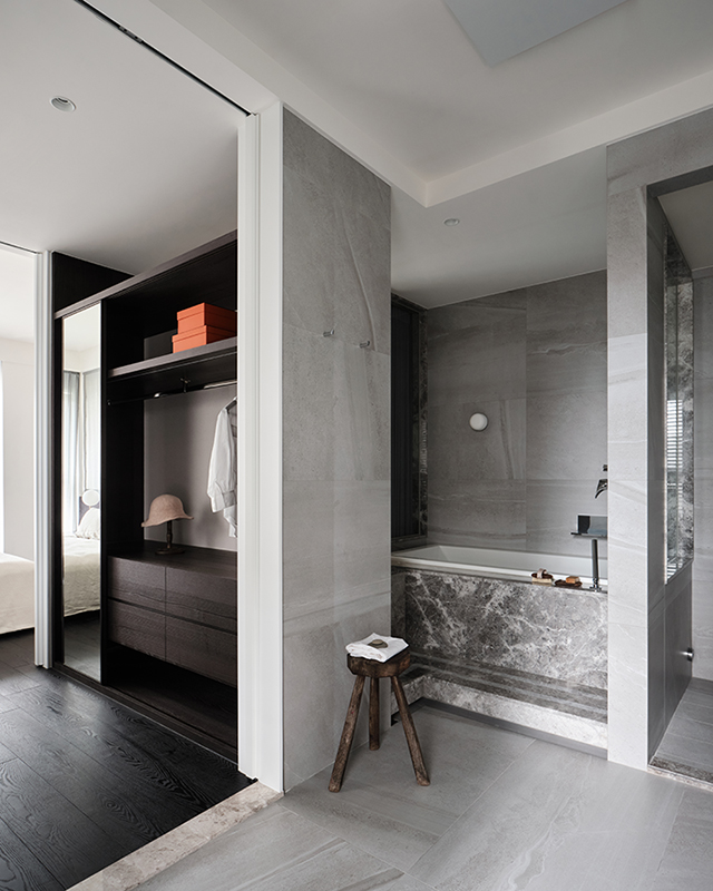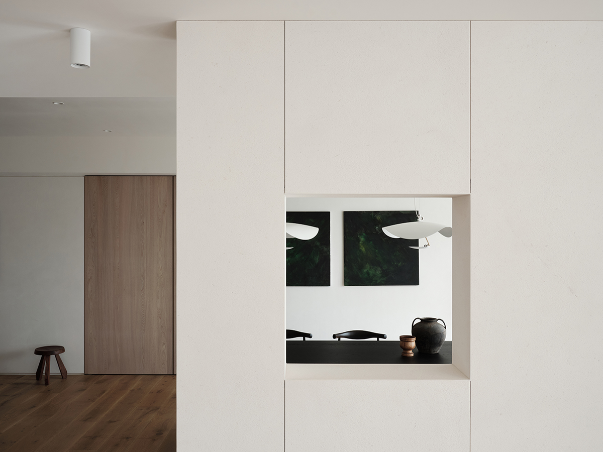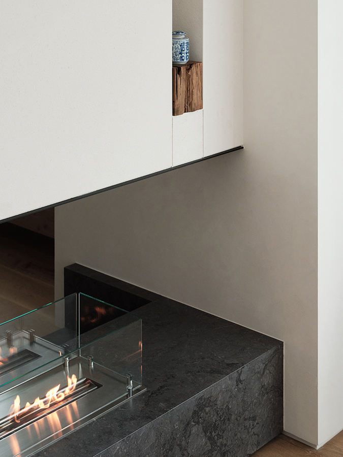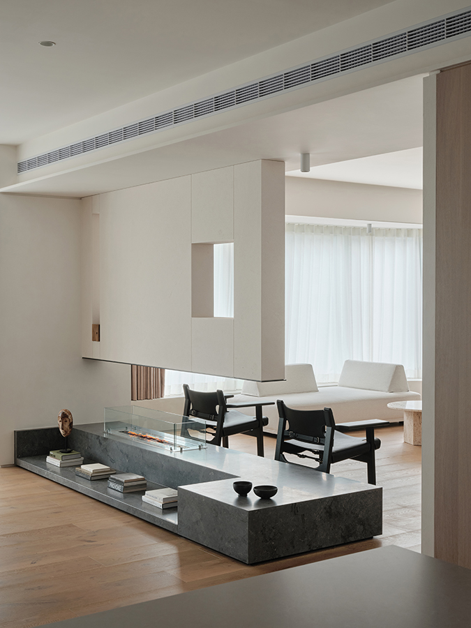 於家中活動區域的中心,建置懸吊牆體。除增加空間層次,牆體開口創造室內窗景,透過窗景讓日常變得有趣。牆體下方石材基座,其複合式機能,一滿足屋主一家書蟲信手捻來閱讀的樂趣、一內嵌火爐,大家圍繞此處,談天交流,好不幸福。轉化原有窗邊結構的缺點,規劃窗台與臥榻,模糊室內與室外的界線,愜意地感受自然變化。