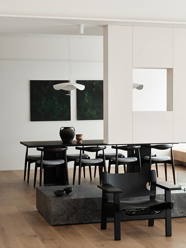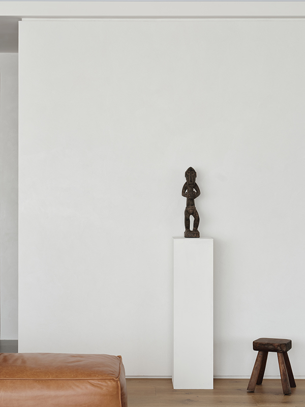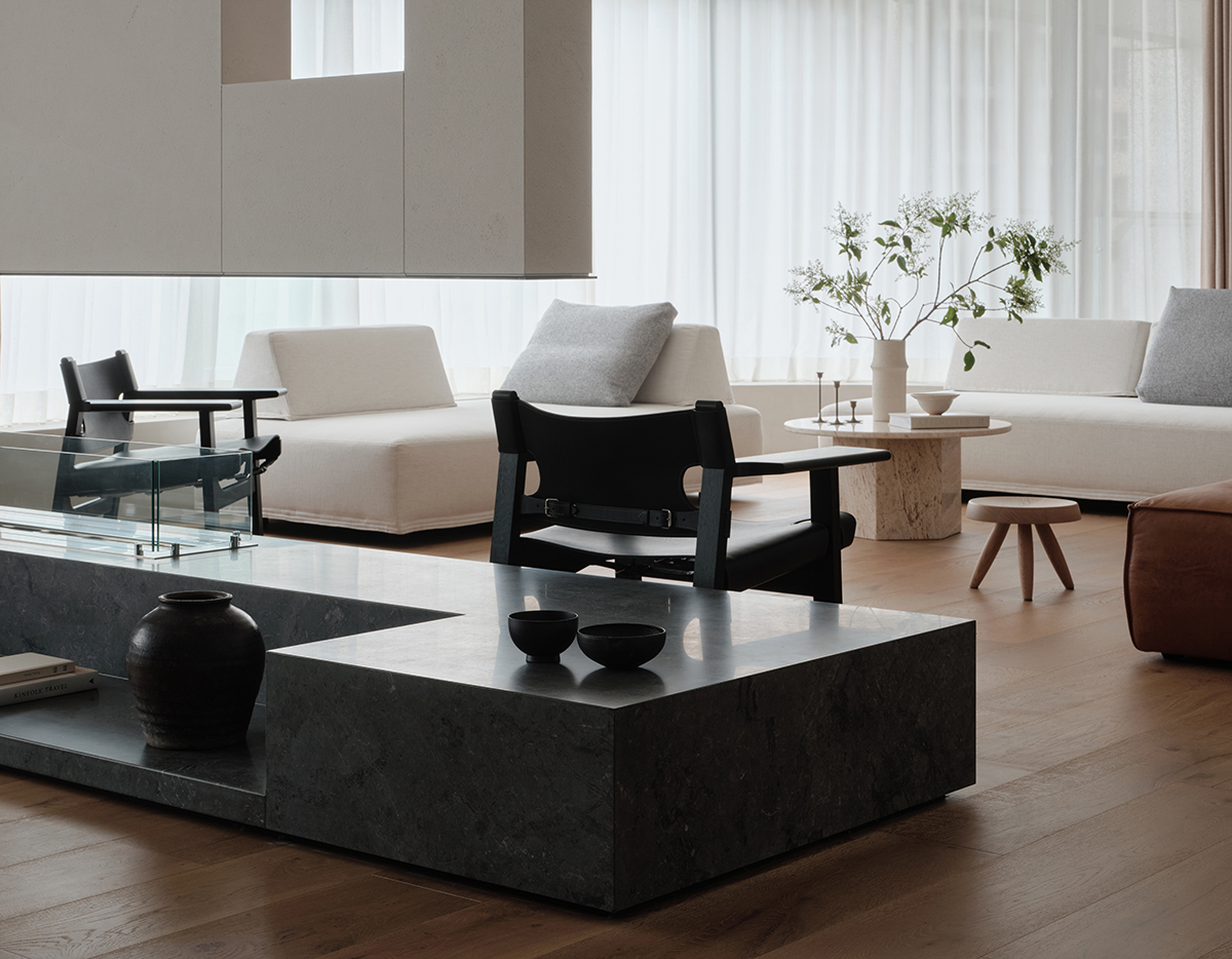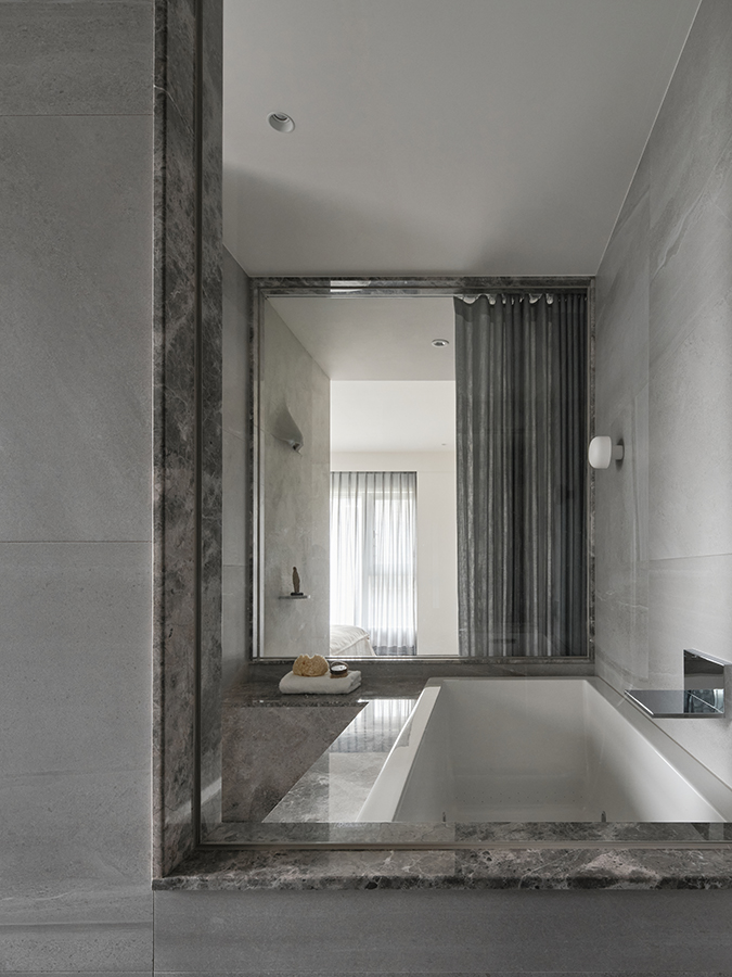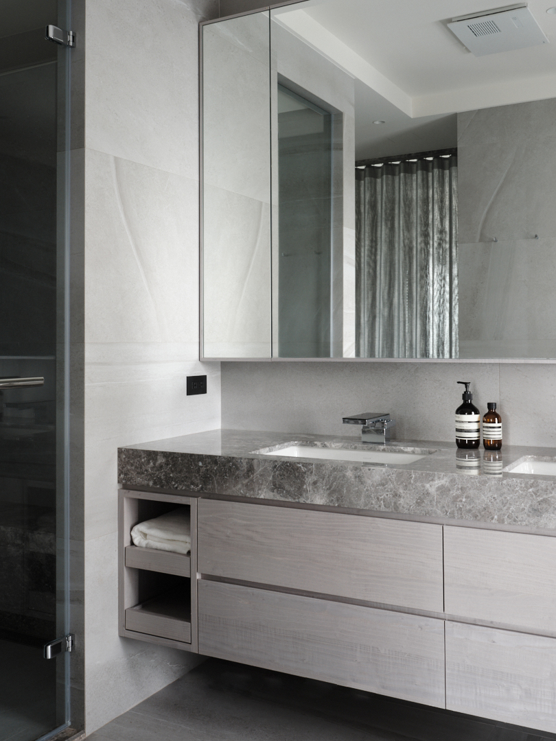 於家中活動區域的中心,建置懸吊牆體。除增加空間層次,牆體開口創造室內窗景,透過窗景讓日常變得有趣。牆體下方石材基座,其複合式機能,一滿足屋主一家書蟲信手捻來閱讀的樂趣、一內嵌火爐,大家圍繞此處,談天交流,好不幸福。轉化原有窗邊結構的缺點,規劃窗台與臥榻,模糊室內與室外的界線,愜意地感受自然變化。