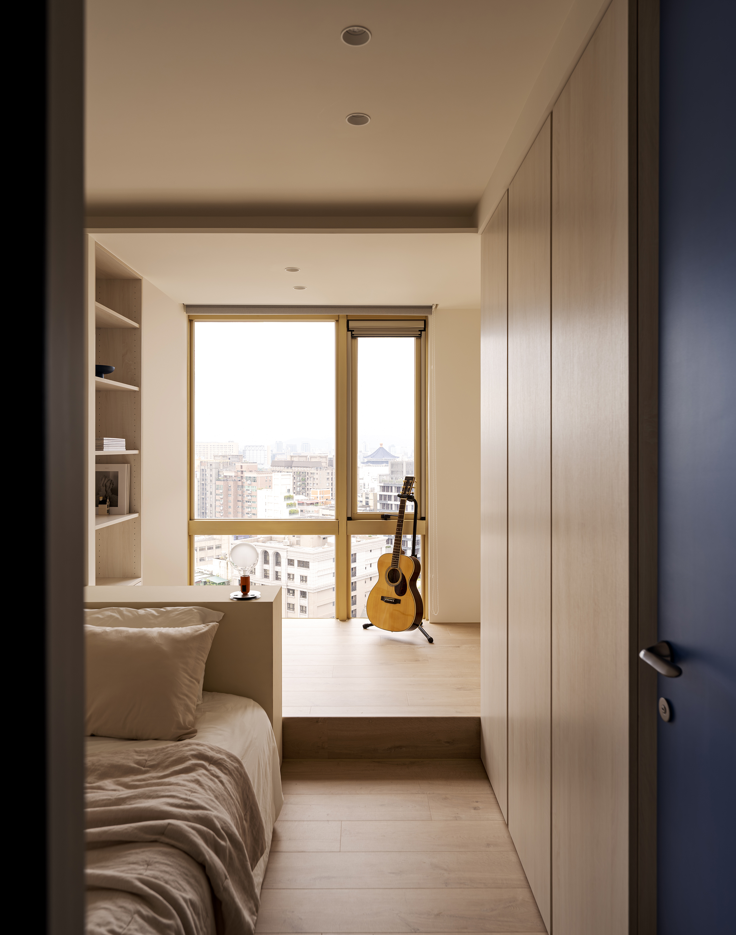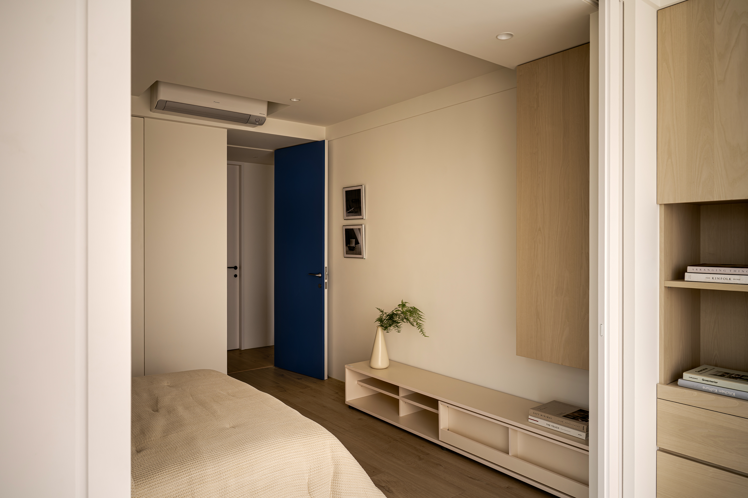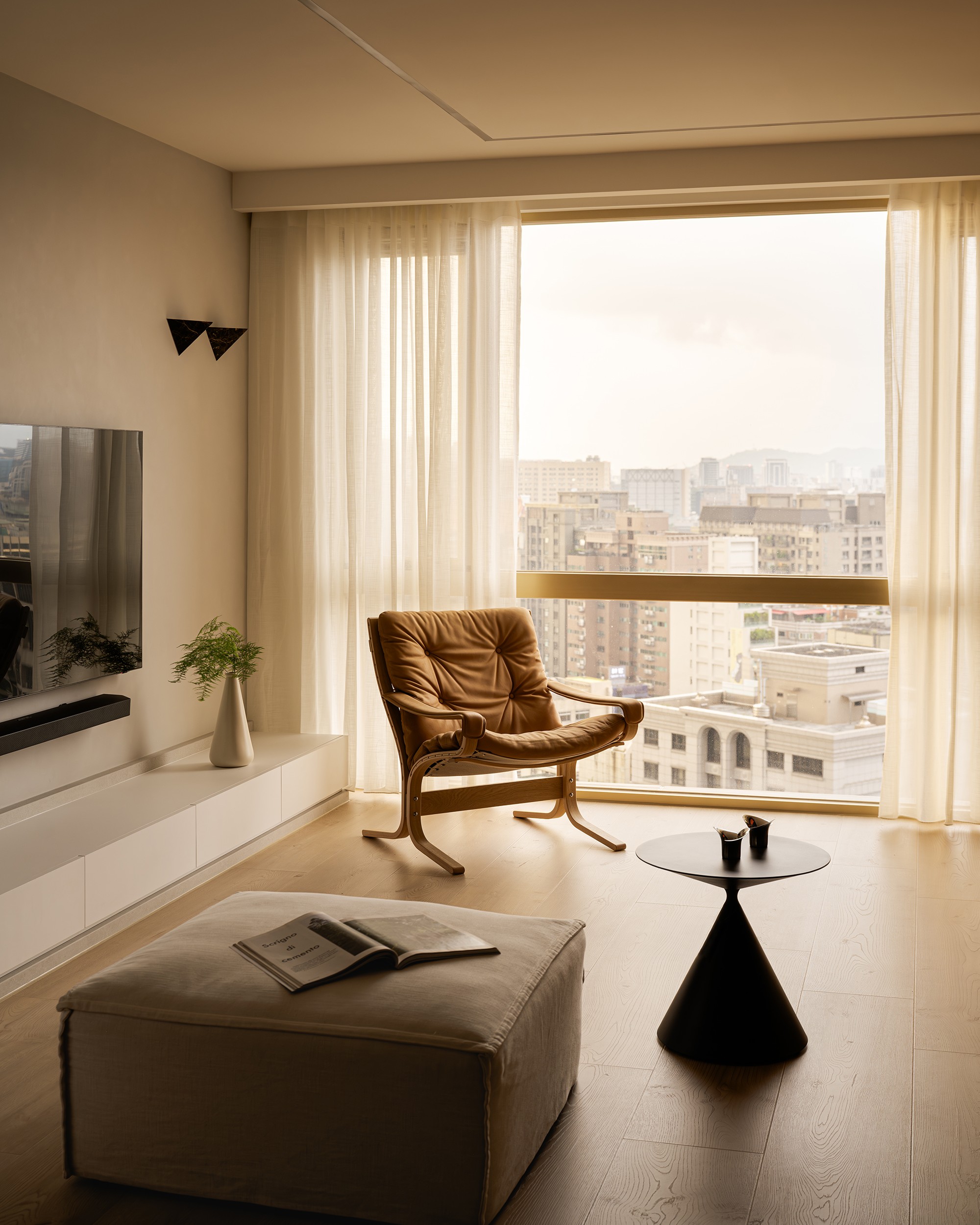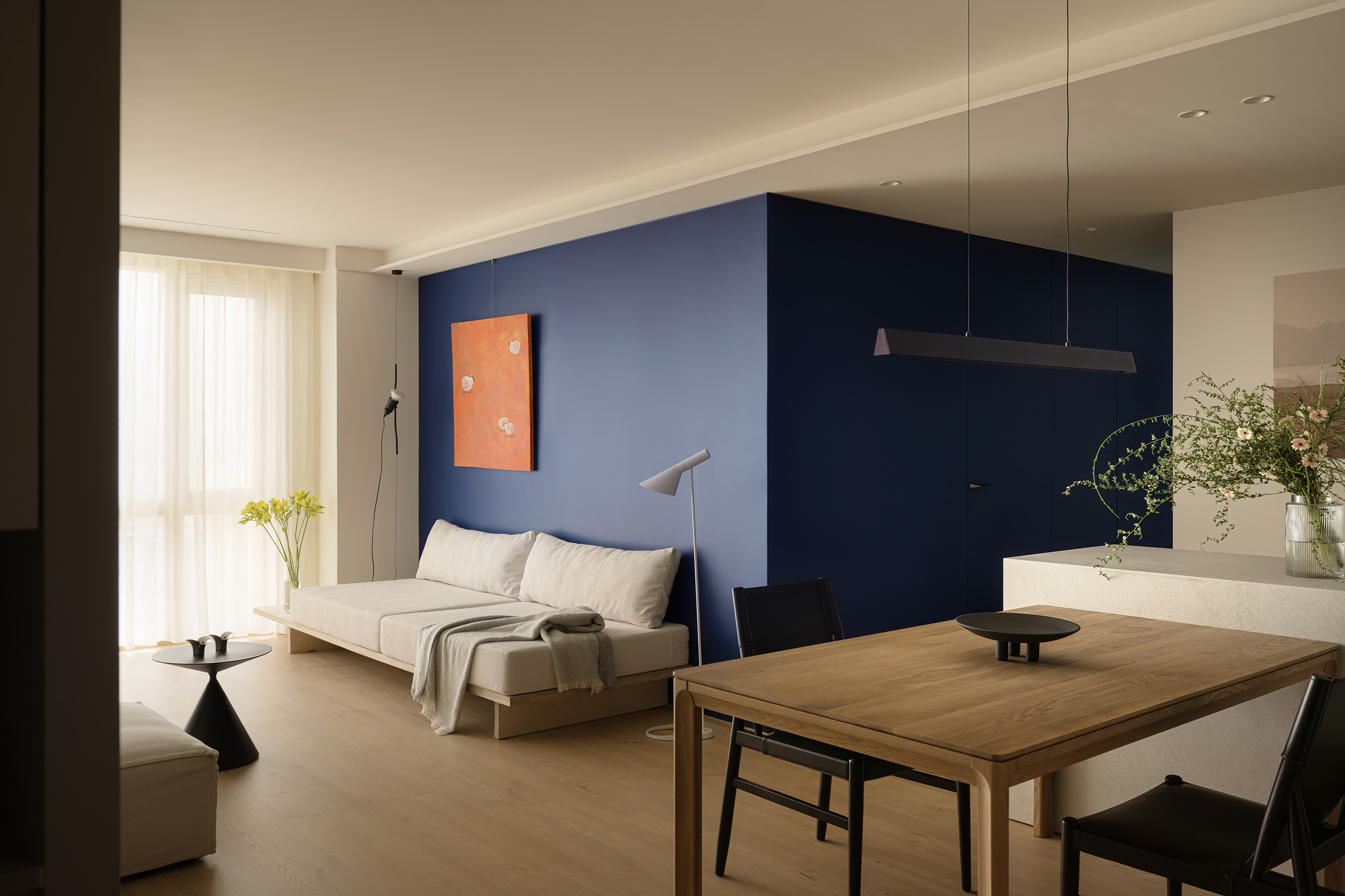 本案為原屋翻修,擁有絕佳視野、能處處俯瞰台北城市光景的優良條件,在重新規劃的設計主軸上,以客廳沙發區L型牆體作為出發點,大膽運用沉穩、純粹的深藍色,在空間中呈現安定感,同時串聯公與私區的視覺引導。