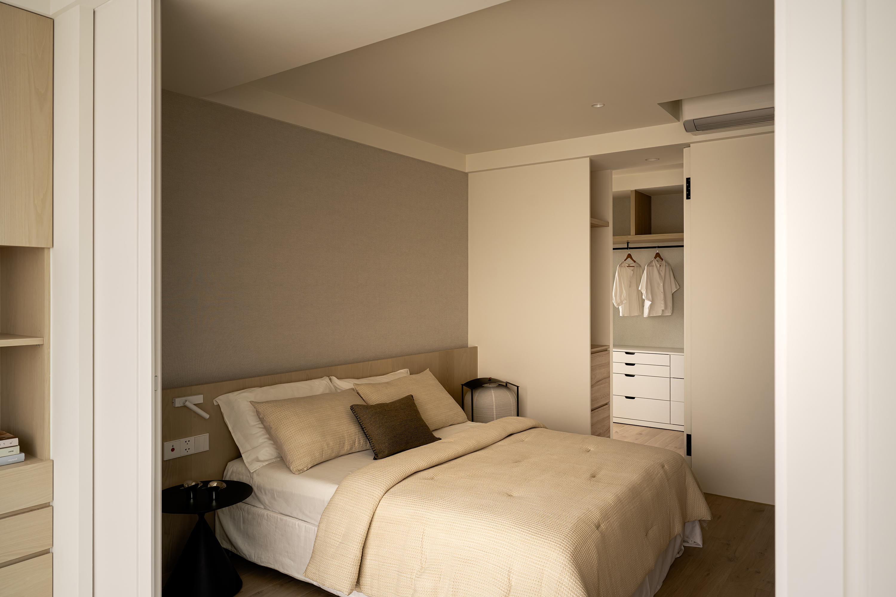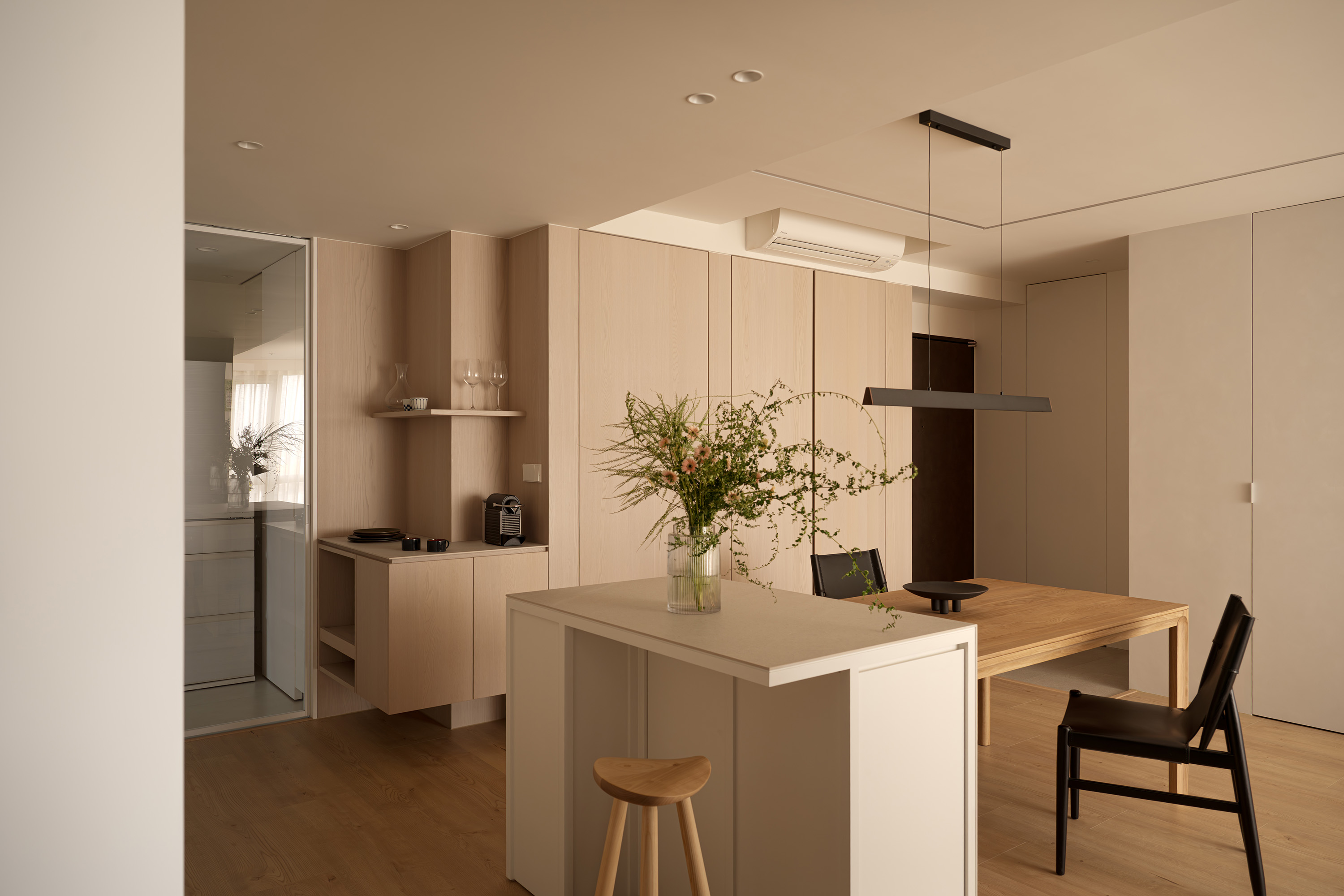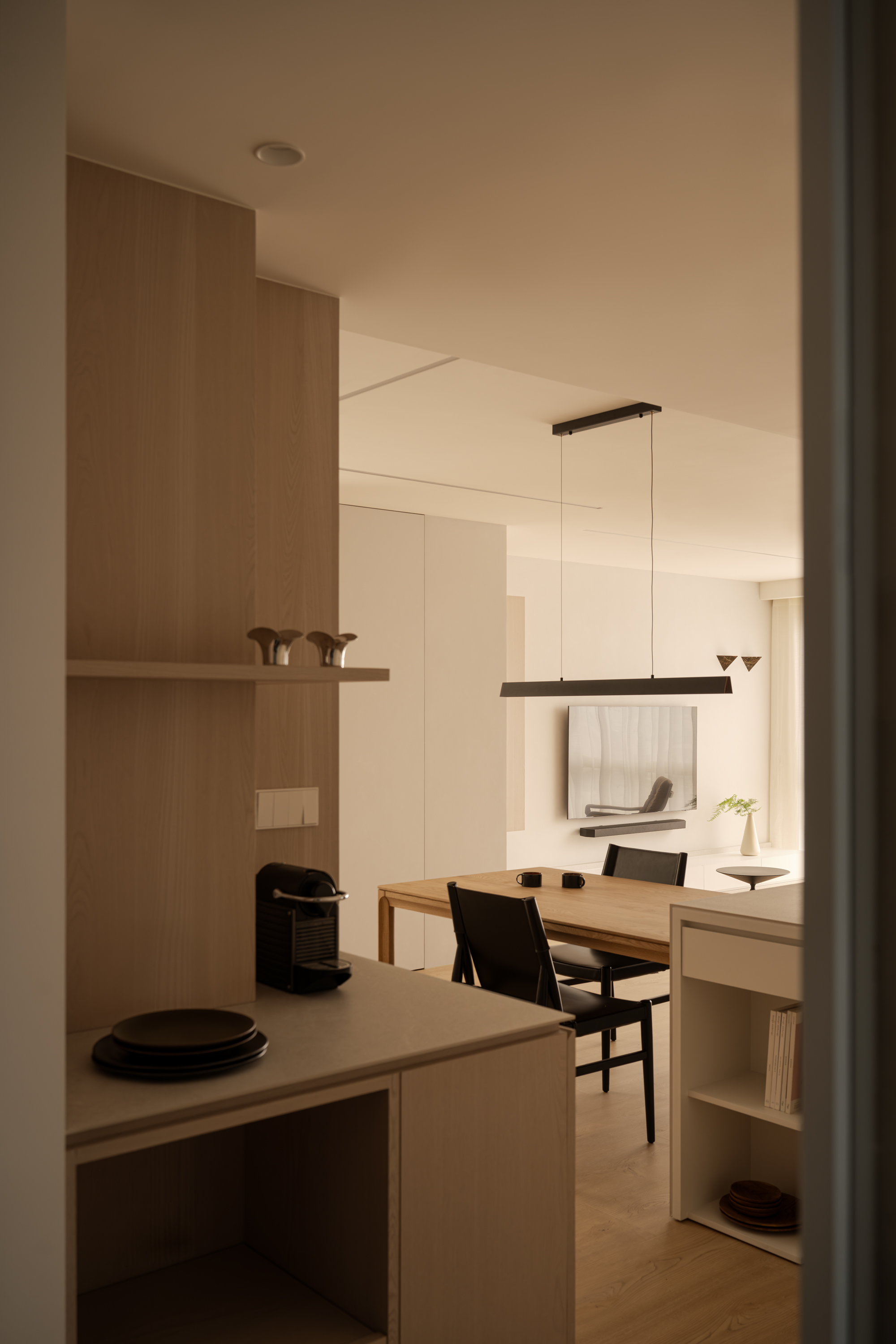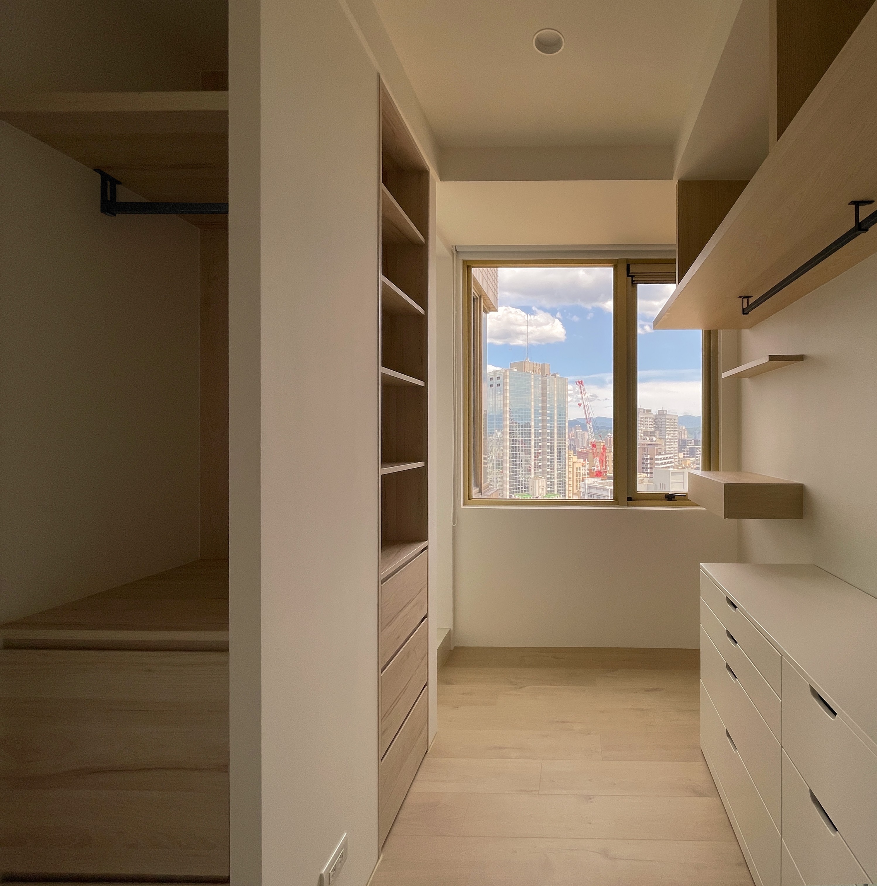 本案為原屋翻修,擁有絕佳視野、能處處俯瞰台北城市光景的優良條件,在重新規劃的設計主軸上,以客廳沙發區L型牆體作為出發點,大膽運用沉穩、純粹的深藍色,在空間中呈現安定感,同時串聯公與私區的視覺引導。