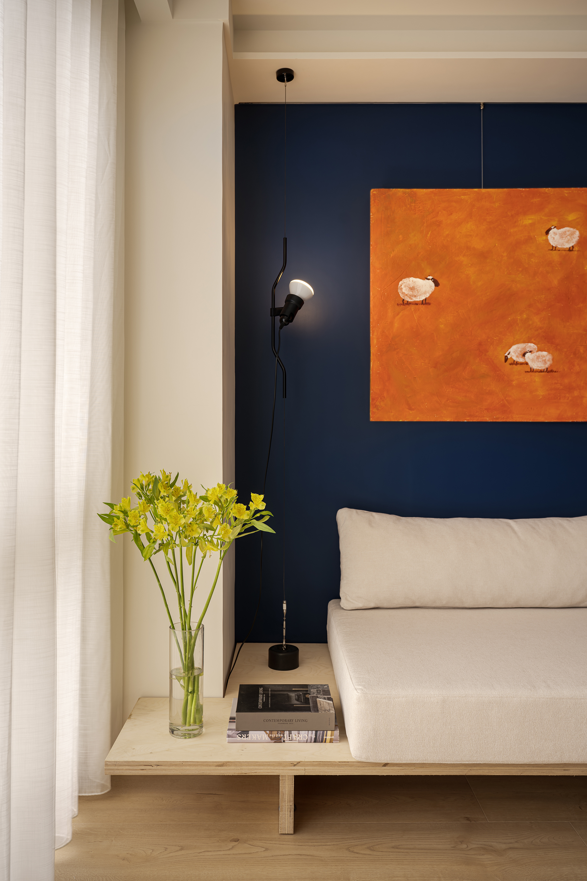 屋主一家是基督教信仰,每每看到屋主夫妻與他們的一對兒女互動時,全家人的關係都特別和樂,這樣的家庭氛圍,感動了公分設計的每個人,團隊特意創作一幅別具意義的畫作,象徵一家四口,四隻羊即使在草場不同區域活動,但最終都會在耶穌的指引下,走在一起,永遠受到看顧與保守。運用藍色的對比色橘色,使畫作在空間中更有視覺張力與故事性,滿溢著活潑的生命力。