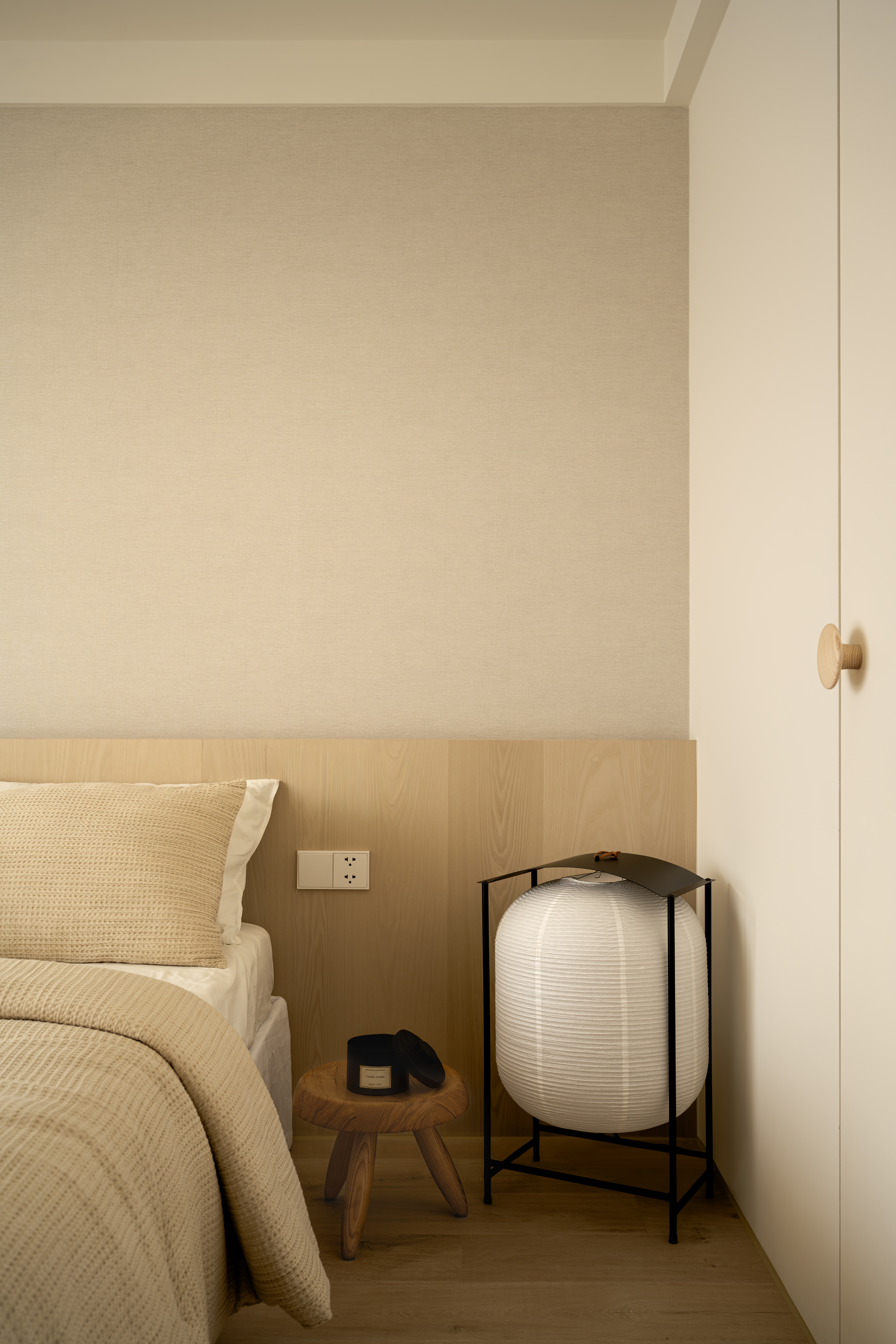 也希望屋主能帶著舊家的記憶,在新家繼續展開新的生活,特意保留部分舊家石材,重新運用在電視牆的造型壁燈上,刻劃出帶有紀念意義的空間亮點。